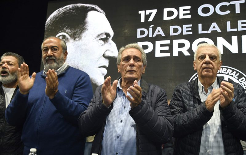 En el escenario también estuvieron los dirigentes sindicales Carlos Acuña (Estaciones de servicio), Armando Cavalieri (Comercio), Luis Barrionuevo (Gastronómicos), Sergio Romero (Docentes) y Julio Piumato (Judiciales), entre otros.