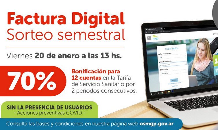 Repitiendo la experiencia semestral de reconocer a los usuarios que, estando con su cuenta al día, hayan optado por la modalidad de “factura digital”, Obras Sanitarias realizará este viernes 20 de enero a las 13 hs un nuevo sorteo que posibilitará beneficiar a 12 cuentas con descuentos directos sobre el pago de los servicios de agua, cloacas y sistema pluvial.