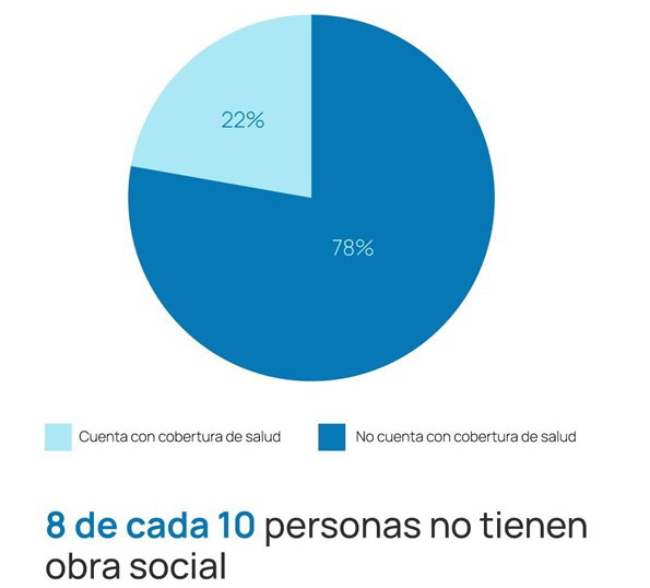 El 78% de las personas encuestadas no cuenta con ningún tipo de cobertura médica (obra social o prepaga), quedando a merced de los centros de salud municipales (CAPS) y el Hospital Interzonal General de Agudos (HIGA).