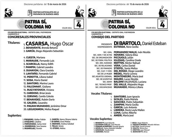 La Lista 4 “Patria Sí, Colonia No” lleva como candidato a la presidencia del PJ a Daniel Di Bártolo, referenciado en el espacio que conduce la exdirectora de ANSES Fernanda Raverta y con respaldo de La Cámpora. Di Bártolo es director del Instituto de Formación de SADOP Nación, congresal del PJ bonaerense y ex funcionario del Ministerio de Trabajo durante la gestión del Frente de Todos.