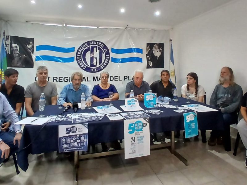 Los Organismos de Derechos Humanos de Mar del Plata-Batán junto a agrupaciones organizadoras de la marcha y movilización a 50 Años del golpe genocida bajo la consigna “50 Años no son Cuento”, realizaron una Conferencia de Prensa este martes en la sede de la CGT.