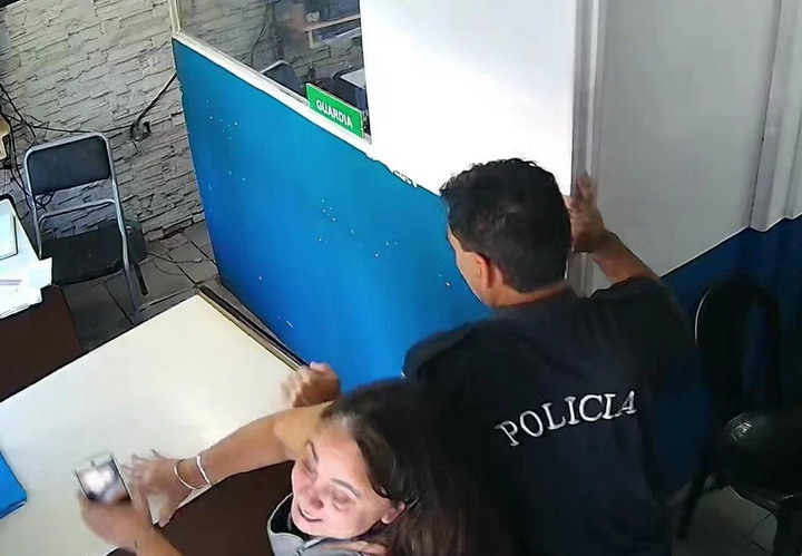 Indignada por la situación, la mujer intentó registrar lo ocurrido con su teléfono celular. En ese momento, el efectivo abrió la puerta de la dependencia y la empujó para obligarla a retirarse del lugar, en una conducta que quedó también captada por las cámaras internas.