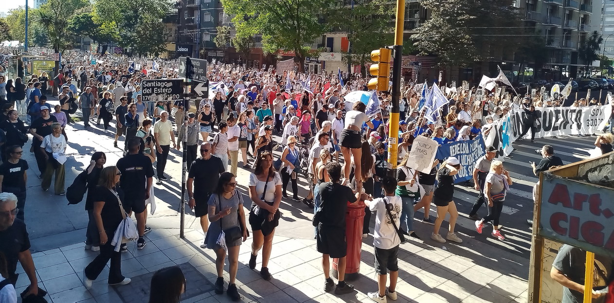 Desde las 14:30 las banderas comenzaron a acumularse en la esquina de Luro y San Luis. El PCR, Partido Obrero, PTS, Libres del Sur, CTA, ATE, el Sindicato de Luz y Fuerza, ADUM y APU entre otras organizaciones, fueron tomando posición bajo una tarde que acompañó con un cielo despejado. Los carteles con la cifra “30.400” y la leyenda “50 años no son un cuento” marcaban el tono de lo que vendría.