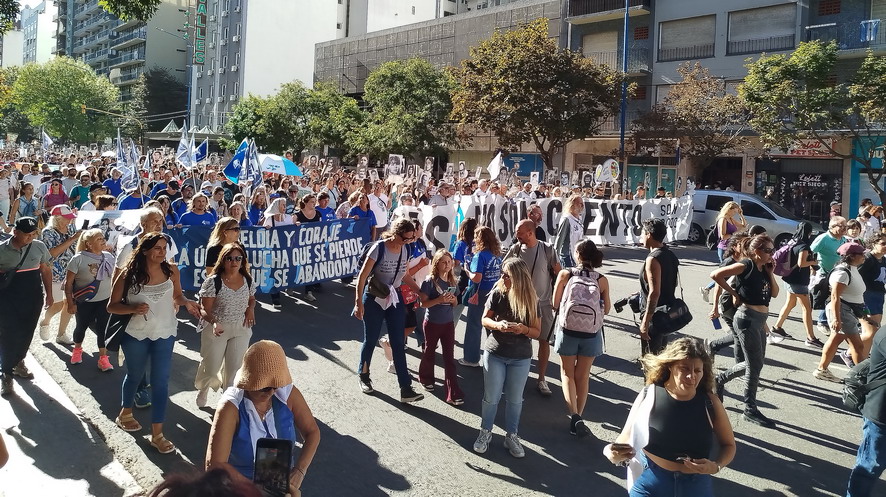 A las 16 horas la columna partió desde el Monumento a San Martín en Luro y Mitre. La encabezaban Madres y Abuelas de Plaza de Mayo junto a los organismos de derechos humanos que convocaron la jornada, detrás, una bandera gigante con el lema de la marcha, y pegada a ella, otra con los rostros y nombres de los desaparecidos en Mar del Plata. La multitud que las flanqueaba a ambos lados obligó desde el arranque a avanzar a paso lento. Luro y todas las perpendiculares desde La Rioja hasta Córdoba quedaron cortadas por la magnitud de la convocatoria.