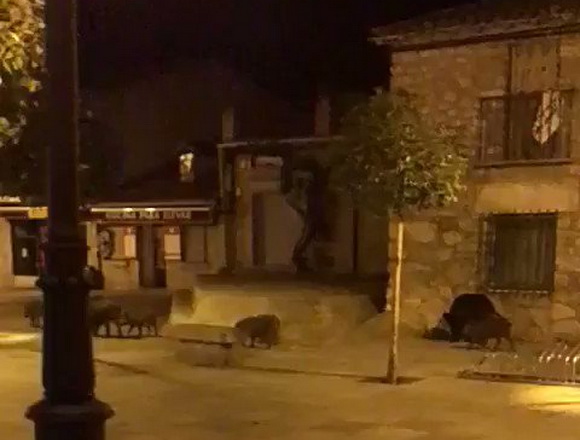 Jabalíes se pasean por el centro peatonal de Torrelodones, a 30 Kms. de Madrid