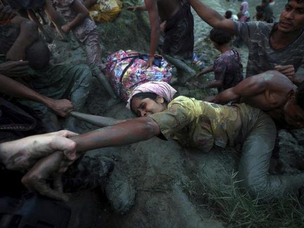 La autora de esta foto tira del brazo de una refugiada rohingya que intenta salir del barro tras cruzar el río Nad, q…
