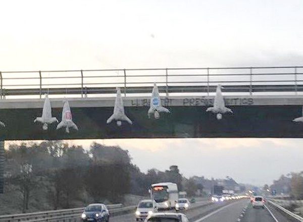 Investigan la aparición de unos muñecos colgados de un puente con los logos de PP, Cs y PSC
